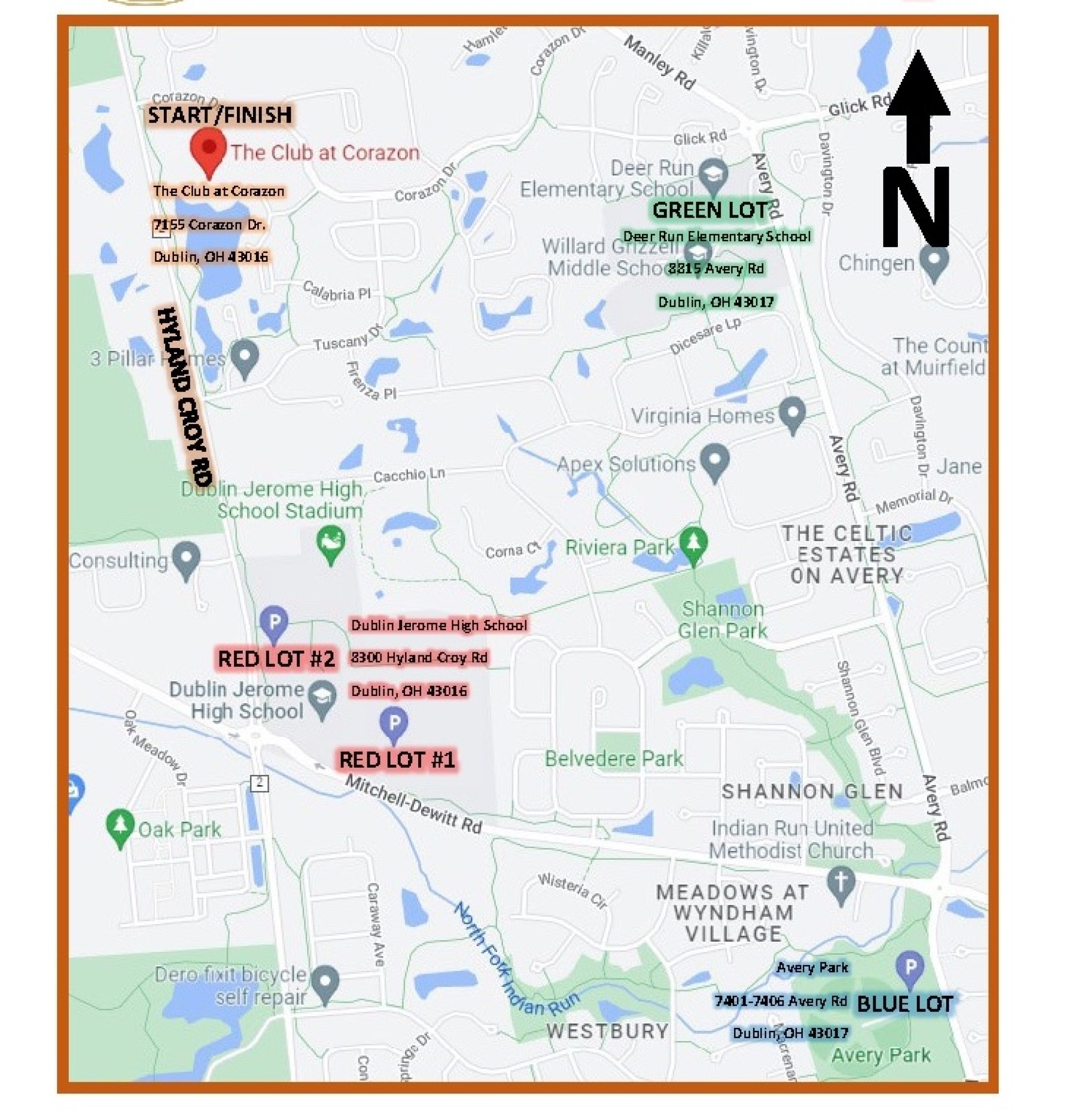 After the Flying Feather Four Miler, buses will run a continuous loop to the three above parking lots (Red Lot, Green Lot and Blue Lot). ALL BUSES WILL RETURN PARTICIPANTS TO ALL LOTS.